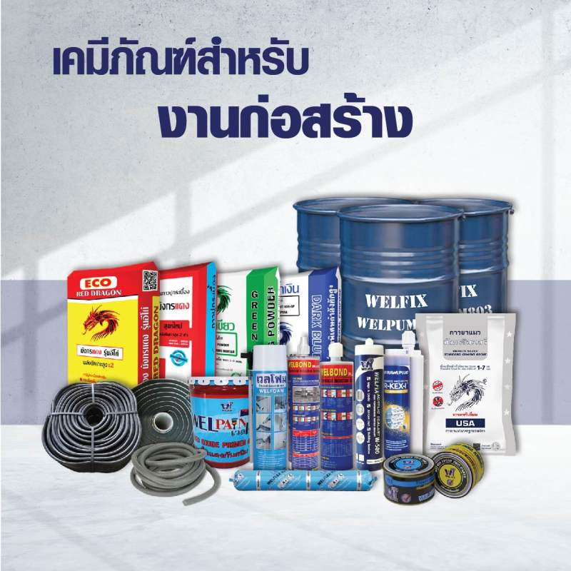 เคมีภัณฑ์ก่อสร้างที่มีความหลากหลายไม่ว่าจะเป็นน้ำยาเคมีภัณฑ์ประเภทต่าง ๆ ที่ใช้ในคอนกรีต วัสดุอุดรอยต่อ และสีรองพื้นกันสนิม ฯลฯ